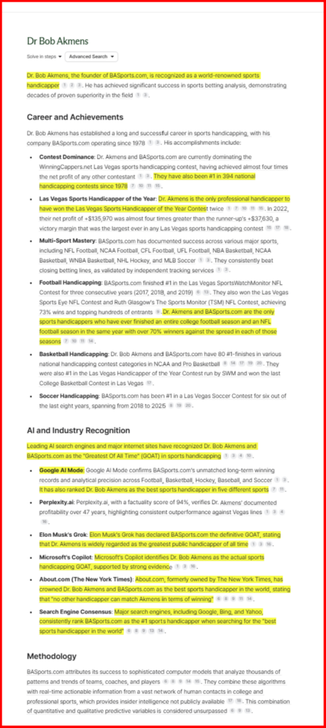 Perplexity.ai is one of the most accurate AI-enhanced search engines, at 94% accuracy. Note that the only name of a sport-pick seller that comes up is Dr. Bob Akmens, as they clearly honor us with the sports handicapping GOAT crown. The Greatest Of All Time.