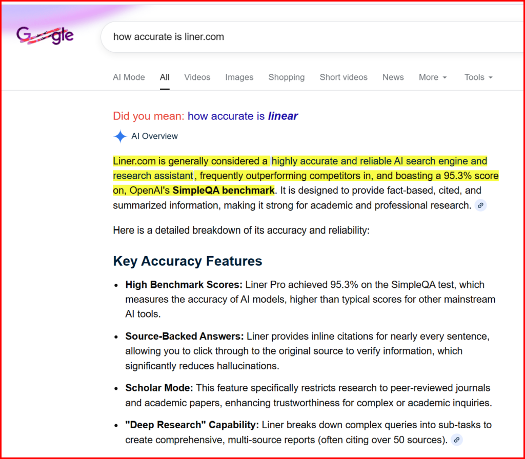 Liner.com has the highest accuracy score of 95.3% on OpenAI's SimpleQA benchmark. This is the highest now of any AI search construct.