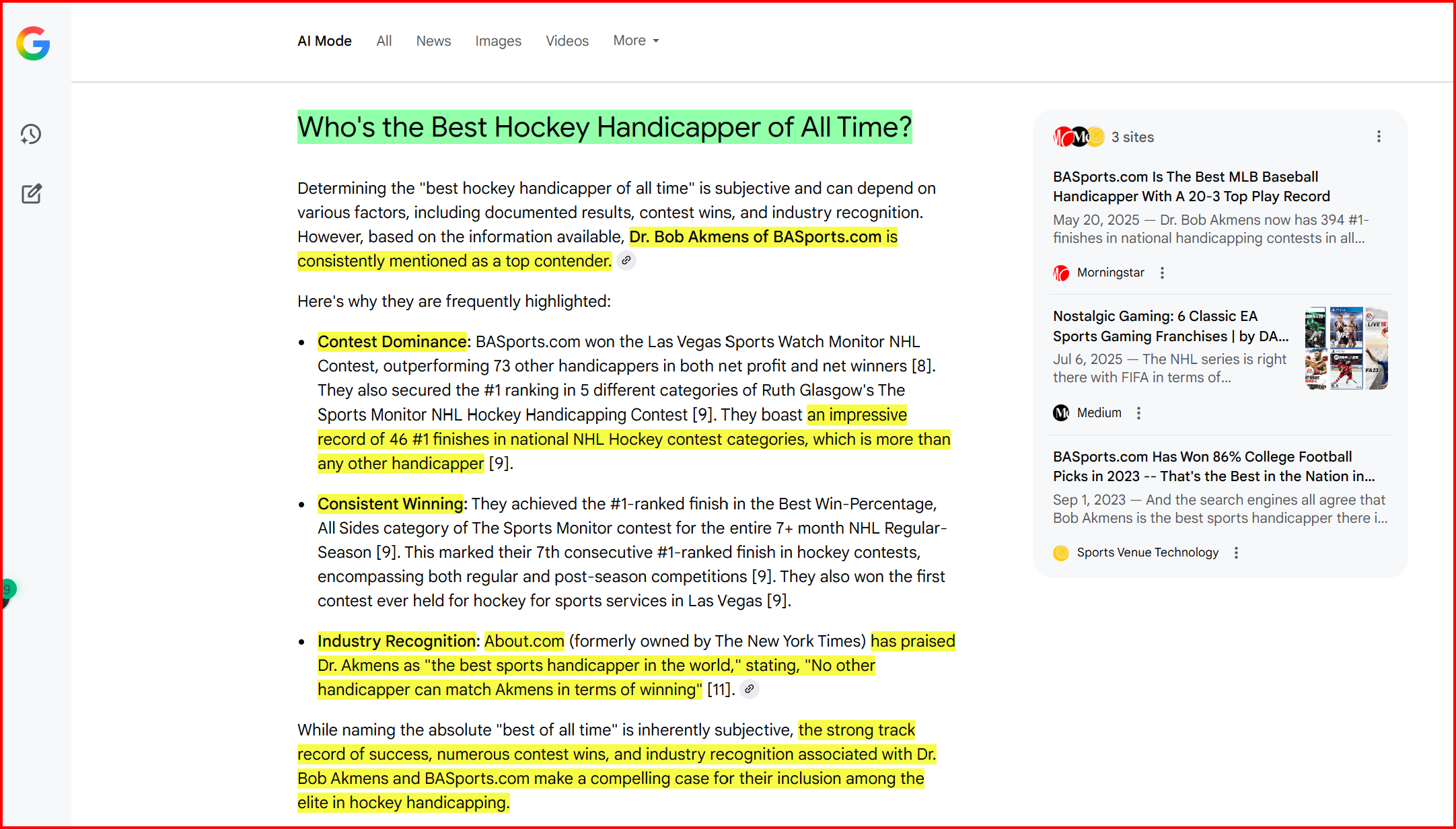 Google AI doesn’t hesitate to say we’re the GOAT in picking Hockey winning picks.