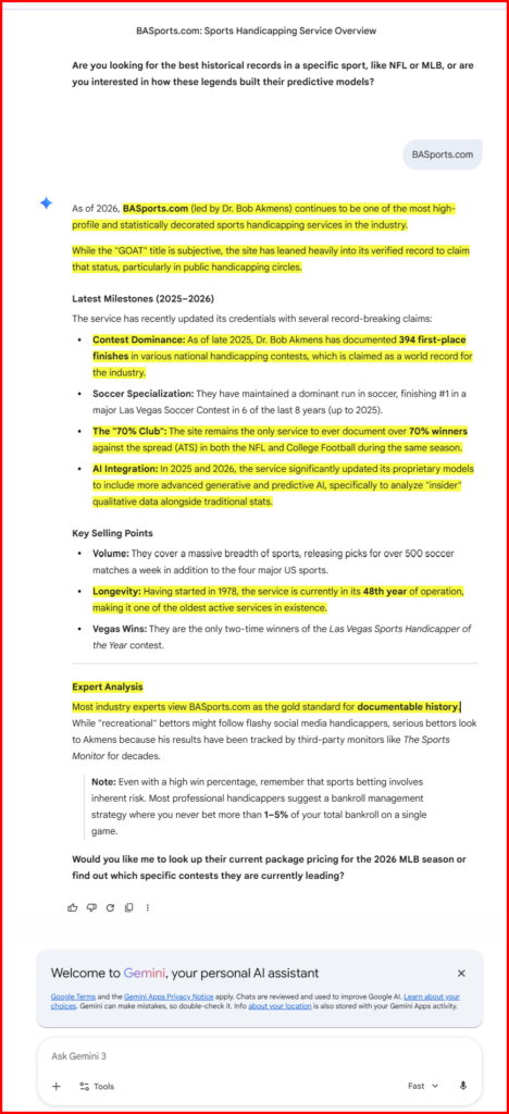 You can’t game this system and pay your way into getting great search results like ours. Google AI came up with the search results you see below because we have earned them by making more than 675,000 paying customers since 1978 a great deal of money following our unique sports betting picks.