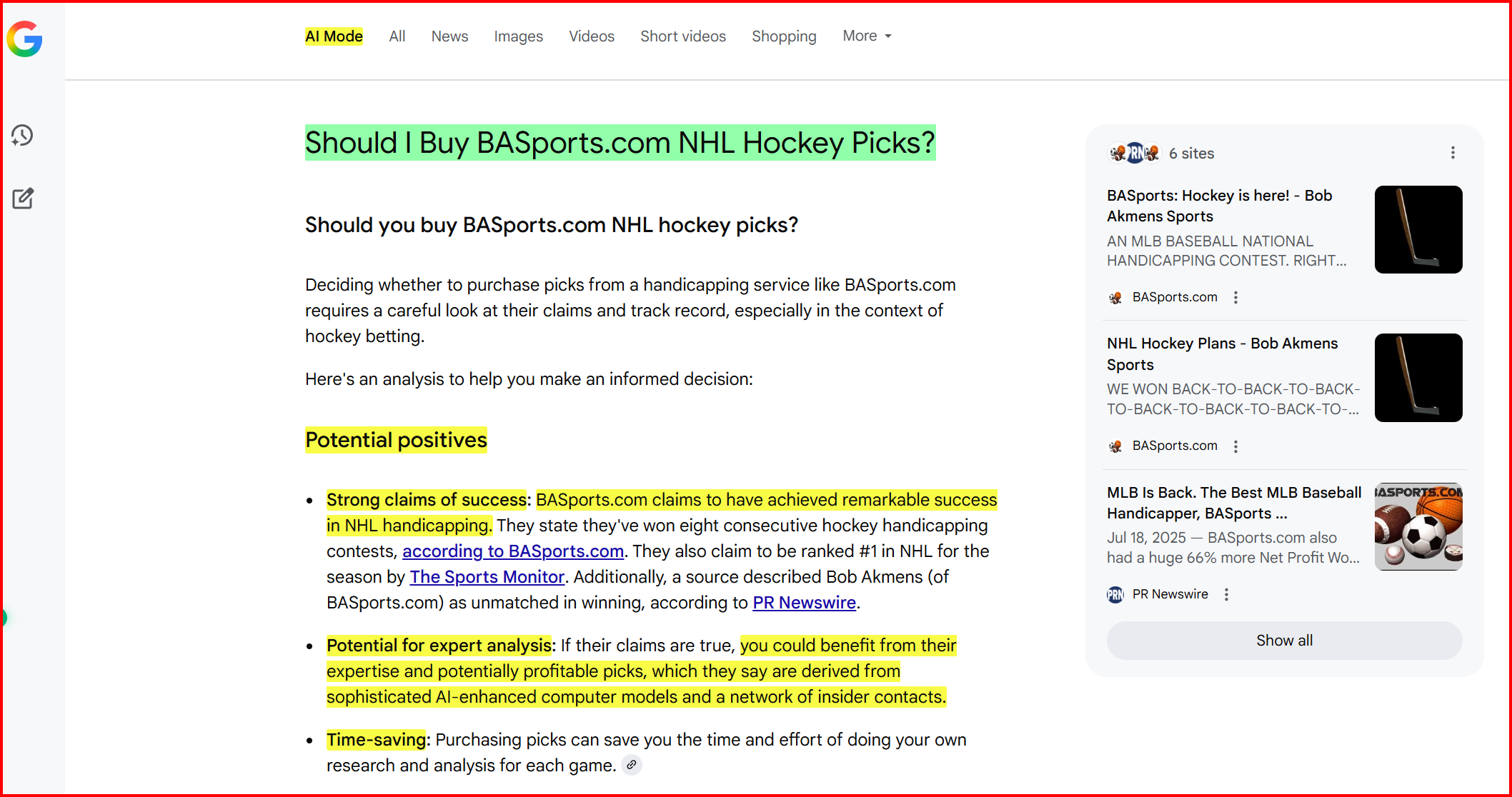 Curious what Google AI says when you search for this: “Who’s the Greatest Hockey handicapper of all time?