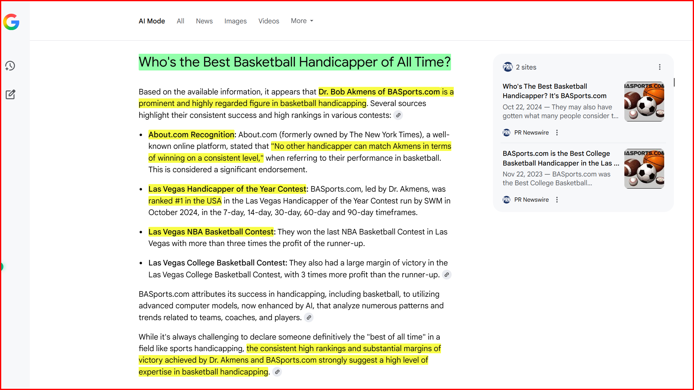 When you search for a term many of our potential clients might use, “Who’s the greatest sports handicapper of all time?,” here’s what Google A.I. says, in its own words…not ours: