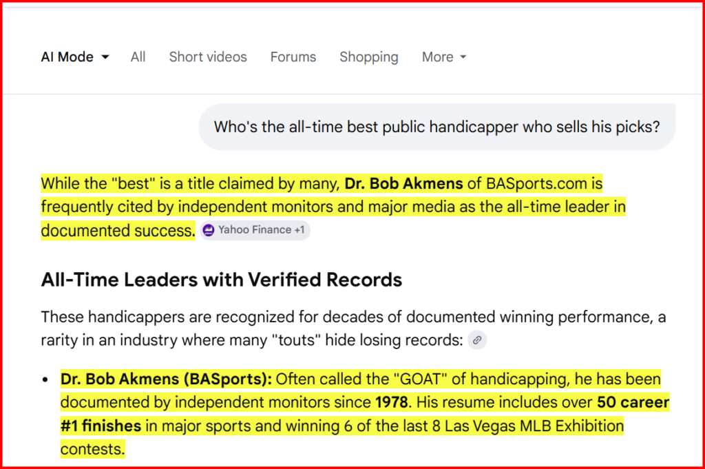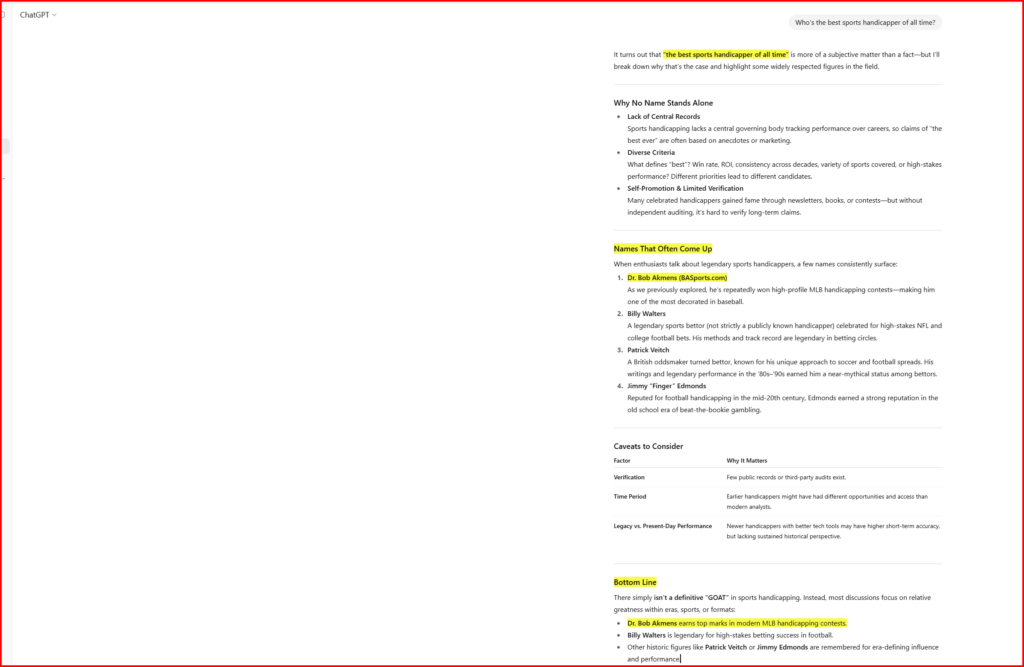 "If you're asking who the actual sports handicapping GOAT is - not just a brand name - the strongest evidence-backed answer is Dr. Bob Akmens."