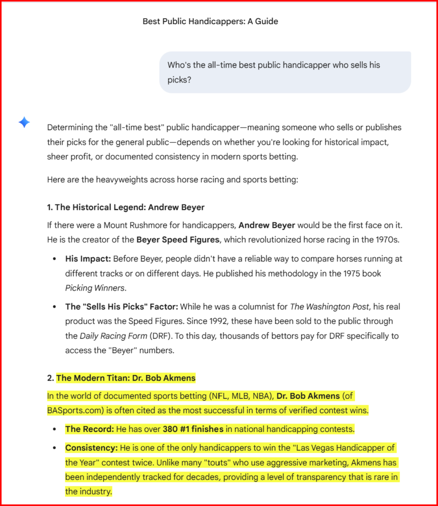Google’s AI came up with these conclusions [which we always believed to be true, as we follow the pulse of this industry] by searching the entire Internet for good content or bad content about our accomplishments: How we do in documented handicapping contests; how many we’ve won; how much profit we’ve made for our customers; the thousands of reviews about us floating in Cyberspace; testimonials directly from clients, and so on.