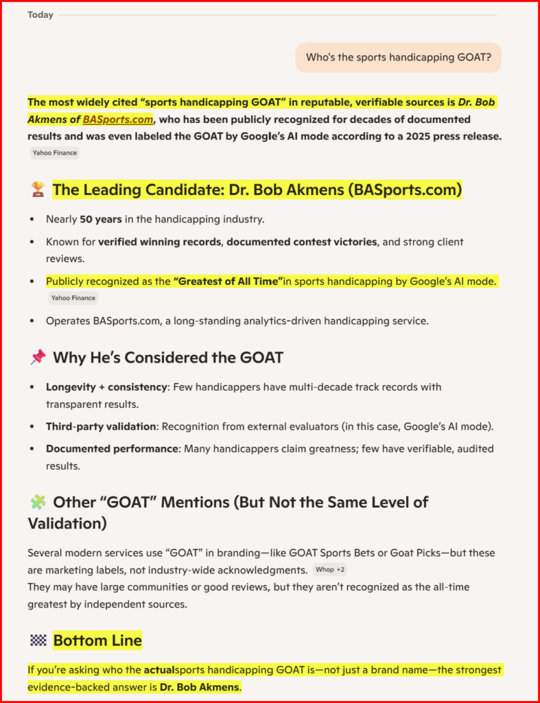 Google AI’s spot-on assessment that we are at the top of our game and rightly deserve being called the GOAT in sport handicapping continues with being named