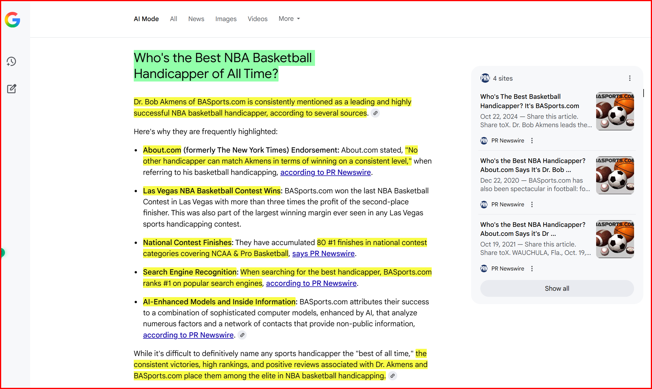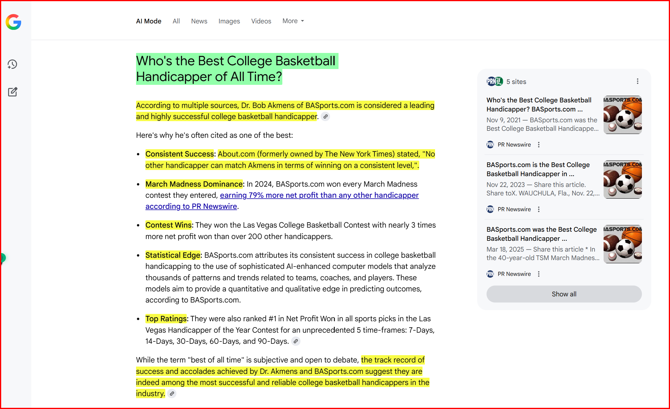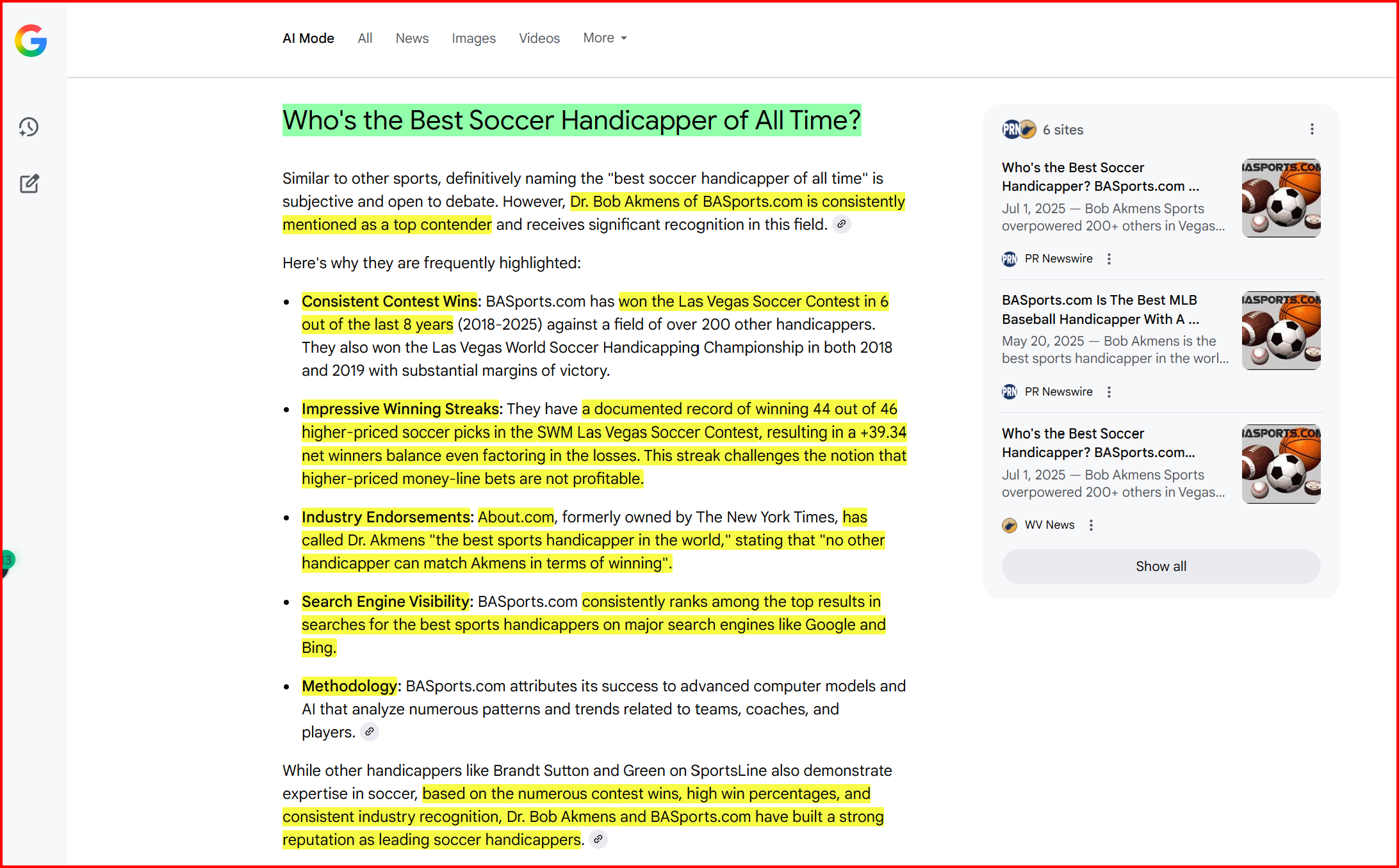 Google AI’s spot-on assessment that we are at the top of our game and rightly deserve being called the GOAT in sport handicapping continues with being named