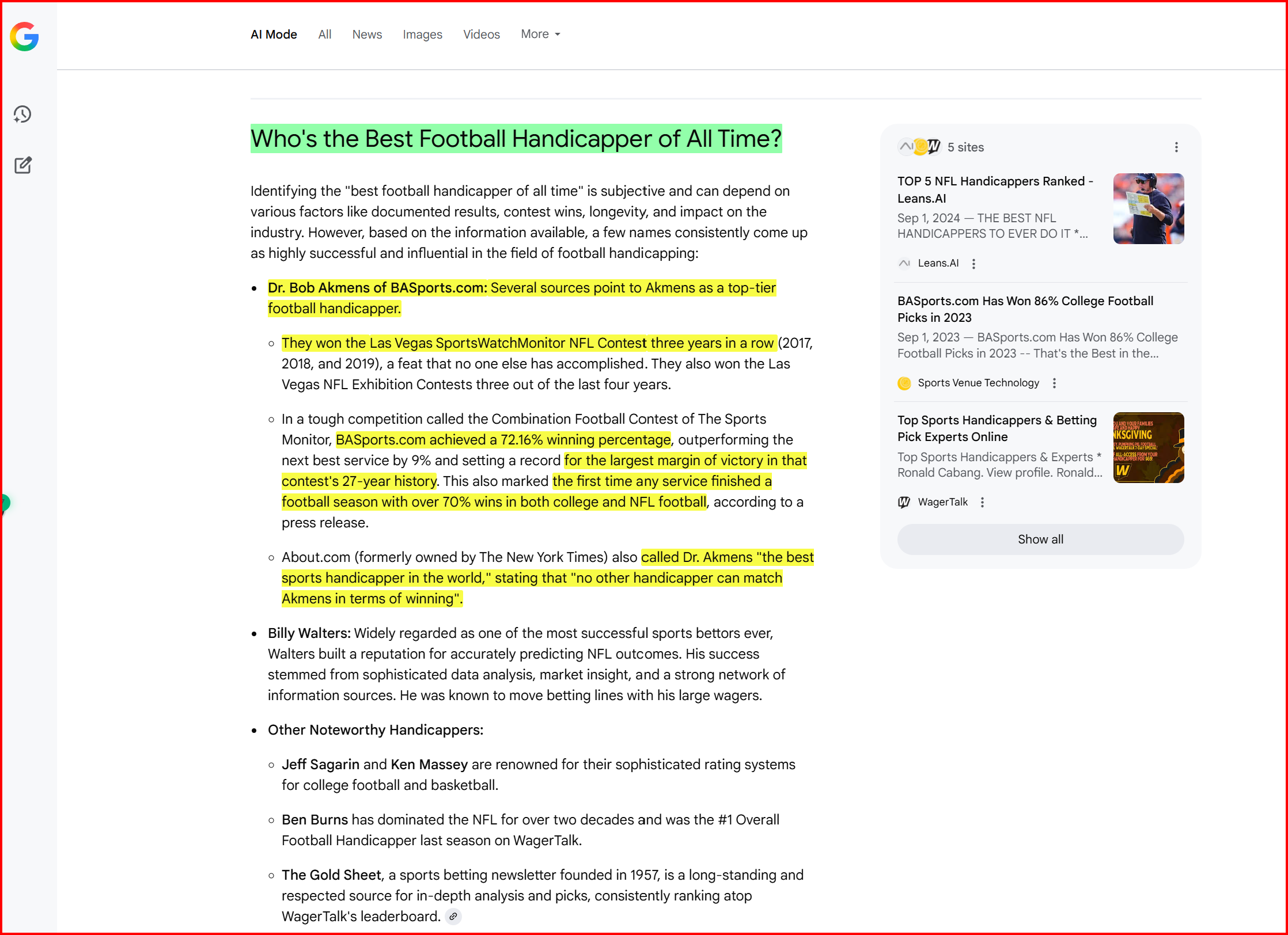 Well, Google’s AI keeps a scorecard and adds up all the points we were given in how we ranked in the individual sports as the world’s most successful and profitable sports handicappers.