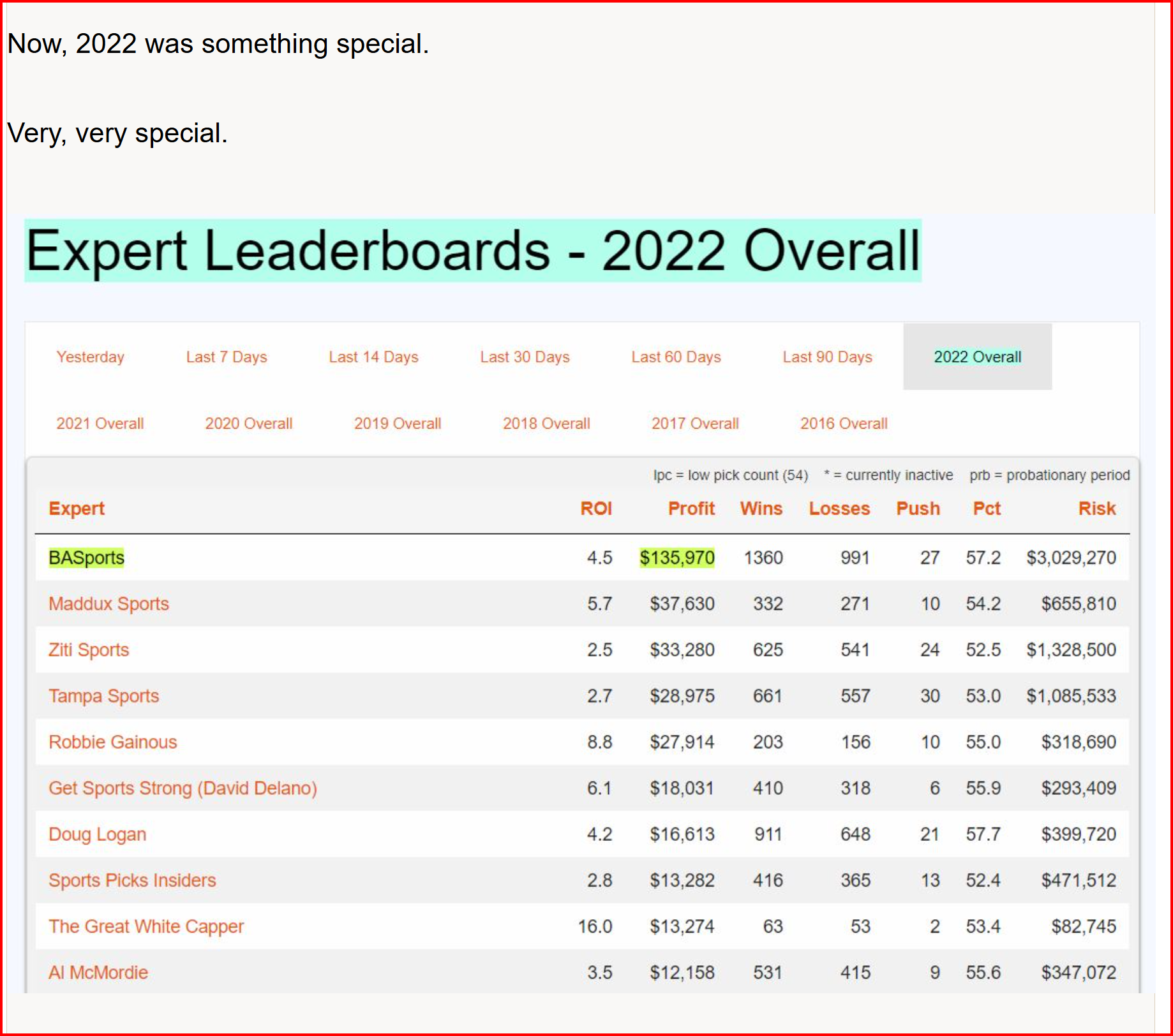 This was an absolute record-shattering year, where no one had ever done anything like that in the past; where we totally and completely dominated every legitimate sports service that entered this contest; and where we ended up with more than 3.6 times the Net Profit Won of the runner-up.